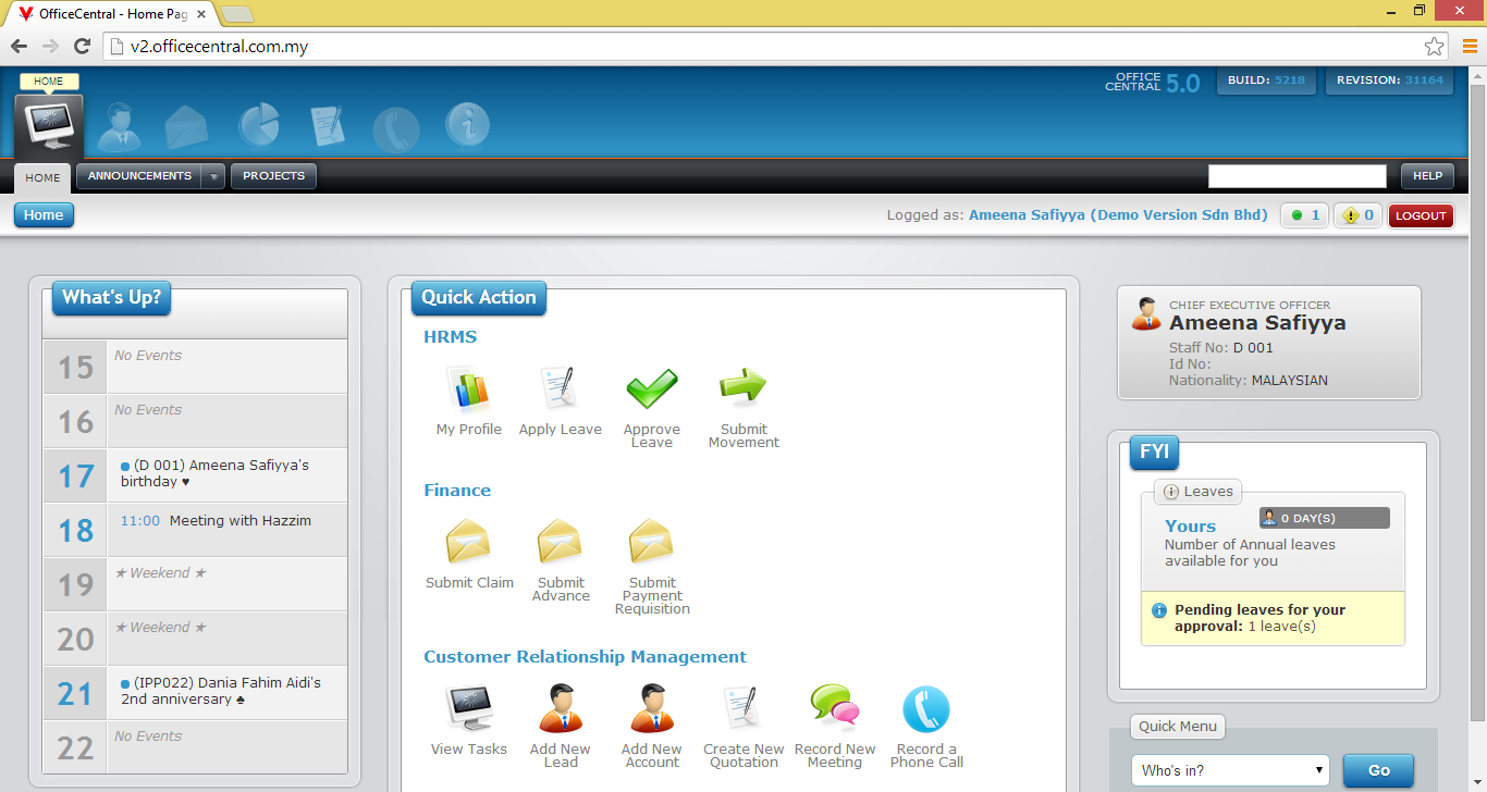 Aplikasi semua dalam satu ini menyediakan pengurusan menyeluruh terhadap sumber manusia yang membolehkan pekerja melihat profile, menghantar tuntutan, memohon cuti dari mana-mana sahaja. Sistem perakaunannya yang kukuh dan cekap, membantu melakukan penggiraan secara automatik lebih-lebih lagi jika menjalankan perniagaan francais, sistem perakaunan e-Francais dapat membantu. OfficeCentral e-CRM adalah satu sistem menyeluruh dalam pengurusan perhubunggan pelanggan yang membantu anda mengurus pelanggan dan bakal klien secara cekap dan berkesan dengan kos yan menjimatkan.