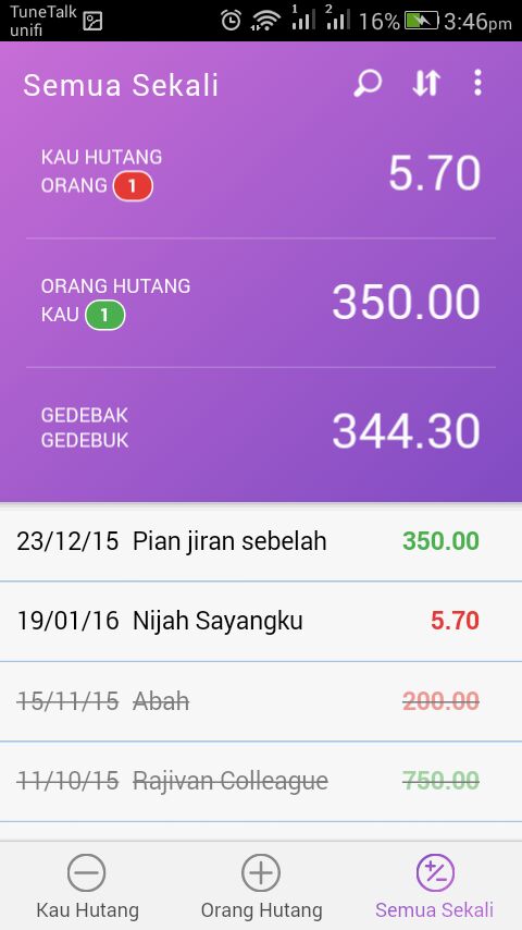 Halaman kedua, Orang Hutang Kau, tidak jauh beza dengan halaman pertama, cuma bahagian jumlah hutang diwarnakan hijau sebagai tanda nilai positif. Halaman terkhir, Semua Sekali memaparkan jumlah keseluruhan hutang-hutang, bersama dengan baki dan juga hutang-hutang yang belum atau telah selesaikan.
