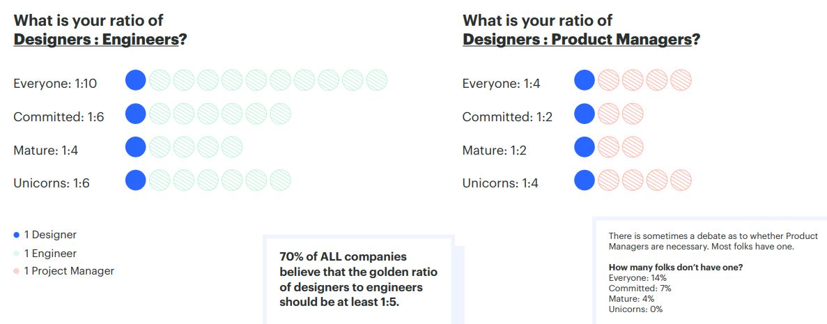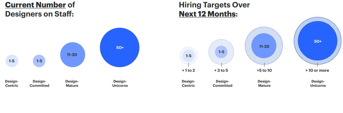 Syaikat permulaan bertaraf Unicorn sekurang-kurangnya mempunyai 50 orang yang terlibat dalam bahagian rekabentuk. Mereka merancang untuk menambahkan 10 atau lebih orang pereka dalam 12 bulan yang akan datang berbanding syarikat permulaan yang Design-Centric dengan 1 – 5 orang pereka dengan penambahan 1 atau 2 orang pereka. Ini menunjukkan mereka yang mempunyai latarbelakang dalam rekabentuk berpeluang besar untuk berkerja dengan syarikat permulaan.