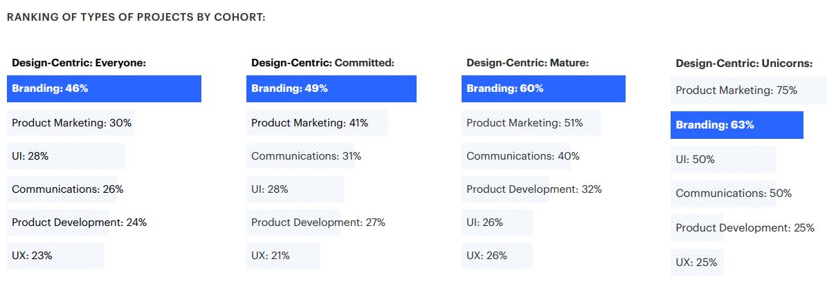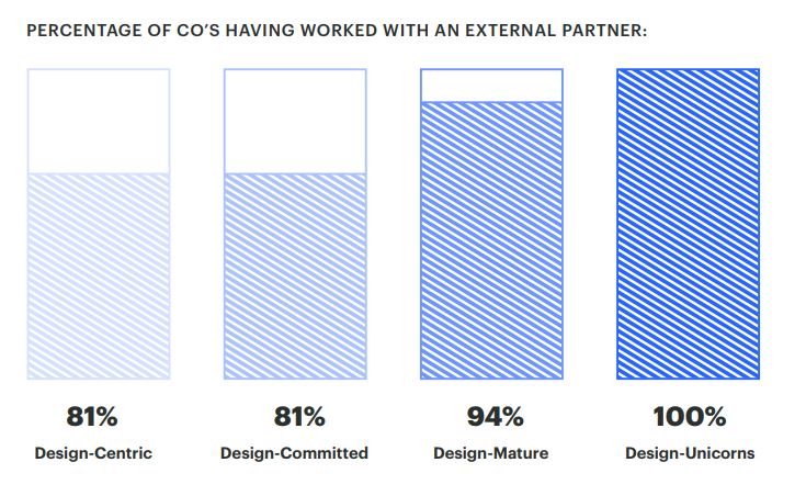 Kajian juga menunjukkan, syarikat permulaan yang matang, lebih-lebih lagi yang bertaraf Unicorn, mementingkan sebuah pasukan rekabentuk khas (dedicated design team) dan dintergrasikan dalam pelbagai bidang bahagian. 50% dari syarikat permulaan yang matang percaya, rekabentuk mempengarui accretive kepada penilaian sebuah syarikat.