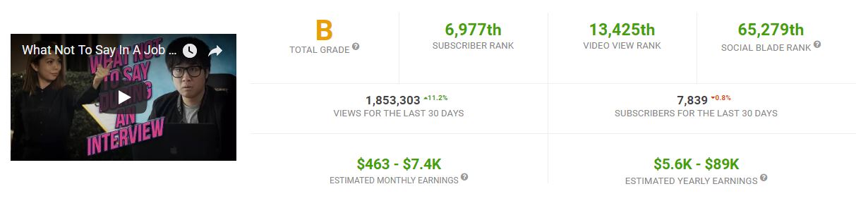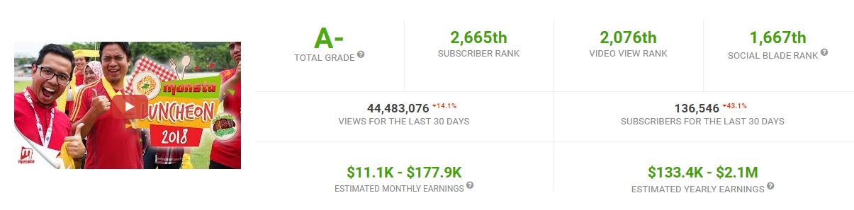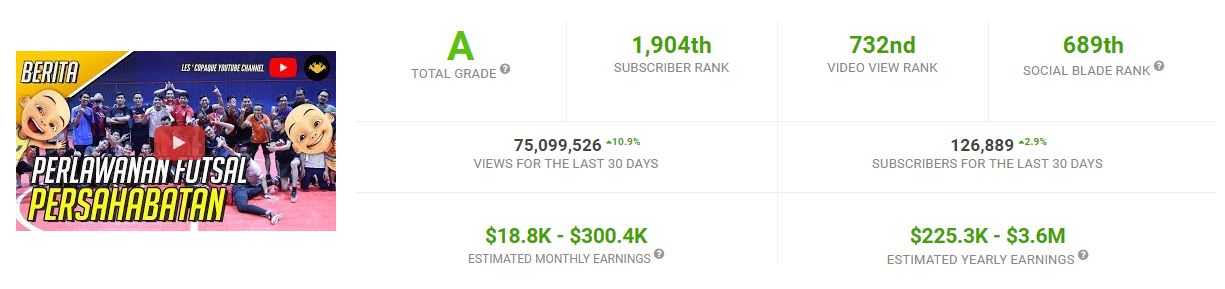 Sebagai contoh; ini adalah anggaran jumlah pendapatan kasar yang dianalisis oleh SocialBlade.com bagi channel Les Copaque Coperation (kenal Upin dan Ipin?) yang berada pada tangga nombor 1 ranking di Youtube Malaysia dengan jumlah subscribers seramai 2,184,976 dengan views sebanyak 75,099,526 dari 30 hari yang lepas.
