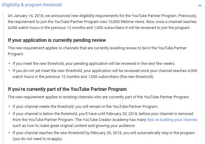 Akan tetapi, 10,000 views amat mudah untuk dicapai. Sehubungan itu, pada 16 Januari 2018, Youtube telah menambahkan syarat baru bagi menapis channel-channel lama yang dianggap SPAM dan mengelakkan juga channel baru yang ingin mengambil kesempatan terhadap YPP dengan menghasilkan kandungan yang tidak berkualiti.
