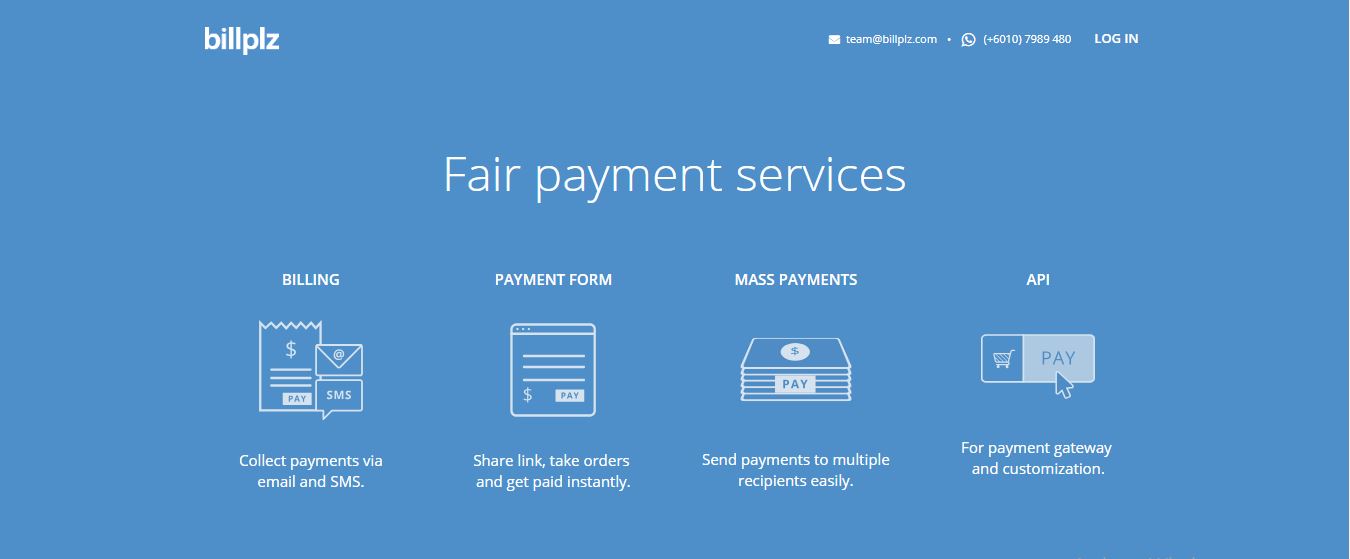Billplz menyediakan khidmat pembayaran bagi Merchants untuk membayar dan menerima pembayaran dengan pantas, pada kos yang paling rendah. Terdapat 4 perkhidmatan yang ditawarkan iaitu, API, Billing, Payment Form dan Mass Payment.