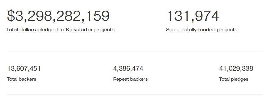 Sejak April 28, 2009, 14 juta orang telah menyokong (backers) projek yang terdapat pada Kickstarter. Sebanyak USD3.3 billion telah dijanjikan (pledged) dan 131,919 projek telah berjaya dibiaya. Kickstarter adalah sebuah pelantar pembiayaan untuk projek-projek kreatif seperti filem, permainan video, muzik, seni dan teknologi.