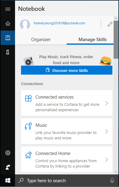 Menggunakan arahan suara, kemaskini Cortana kini boleh memainkan muzik kegemaran anda dan playlist pada Sportify, TuneIn dan iHeartRadio. Ciri ini perlu diaktifkan terlebih dahulu dengan melancarkan Cortana dan kemudian memilih ikon Notebook, seterusnya “Manage Skills” dan akhirnya pilih kategori muzik.