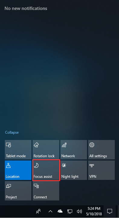 Jika anda ingin menumpukan perhatian terhadap sesuatu dan tidak mahu diganggu oleh notifikasi, Fokus Assistant mempunyai fungsi tersebut. Segala notifikasi, bunyi, amaran, dan lain-lain elemen yang mengganggu akan dihalang. Ia boleh diaktifkan melalui Action Center dan kemudian menekan butang “Fokus Assist”.